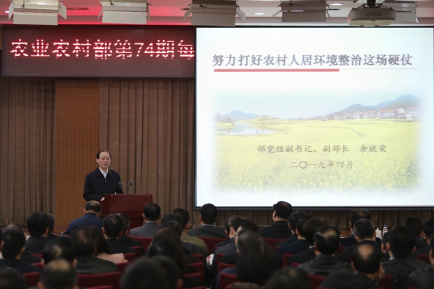 4月3日,農業農村部舉辦第74期每月講壇,農業農村部黨組副書記、副部長余欣榮作題為“努力打好農村人居環境整治這場硬仗”專題報告。他強調,改善農村人居環境是黨中央作出的一項重大決策,是全面建成小康社會的硬任務,也是實施鄉村振興戰略的一場硬仗,要深入學習領會習近平總書記關于改善農村人居環境的重要論述,進一步認清形勢,聚焦重點任務,完善推進機制,狠抓工作落實,堅決打好這場鄉村振興開幕之戰。