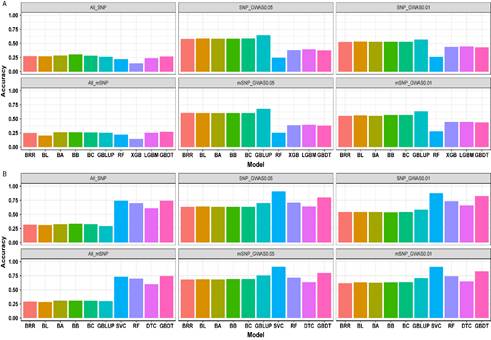 該研究利用大黃魚體重性狀數(shù)據(jù),比較機(jī)器學(xué)習(xí)、GBLUP、貝葉斯等模型的育種值預(yù)測準(zhǔn)確性。研究表明,不同模型與變異數(shù)據(jù)集的耦合分析差異較大,機(jī)器學(xué)習(xí)模型在分類性狀預(yù)測中準(zhǔn)確性更高。相關(guān)成果獲授權(quán)國家發(fā)明專利“與大黃魚生長性狀相關(guān)的SNP分子標(biāo)記及其應(yīng)用”,并以 “Comparative analysis of genomic prediction models based on body weight trait in large yellow croaker (Larimichthys crocea)”為題發(fā)表文章在《Aquaculture》,碩士研究生方家璐和徐慶磊副研究員為共同第一作者,許建研究員和東海所彭士明研究員為共同通訊作者。該研究有助于提升魚類全基因組選擇預(yù)測的準(zhǔn)確性和育種效率,為機(jī)器學(xué)習(xí)模型在育種中的深入應(yīng)用提供了重要參考。